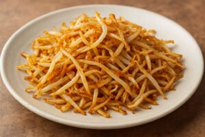 - Usmažené kuličky ozdobíme proužky mrkve a cibule.