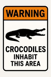 Místa, kde můžete na krokodýla narazit, jsou v Austrálii označená velkými výstražnými cedulemi s obrázkem krokodýla a textem Nebezpečí. Na tomto území žijí krokodýli. Napadení může způsobit zranění nebo smrt.
